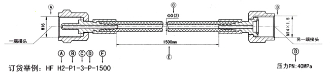2、用戶欲訂購一端是快換式接頭,其接頭螺紋為M16,另(lìng)一端是直接接壓力表,其接口螺紋為M14×1.5,通徑為3mm,軟管長度(dù)為1.5m的軟管總成,訂貨(huò)型號(hào)是:HFH2-P1-3-P-1.5。